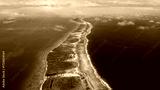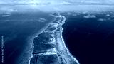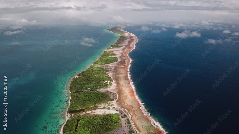 French Polynesia, Rangiroa island: Aerial view of motu atoll in French Polynesia features a narrow land strip covered in vegetation. Wild nature travel landscape. Drone flight