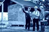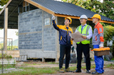 Three Asian construction workers inspect a house that is still under construction. The team points out roof details while the foreman holds rolled blueprints. Workers are wearing vests and helmets.