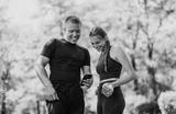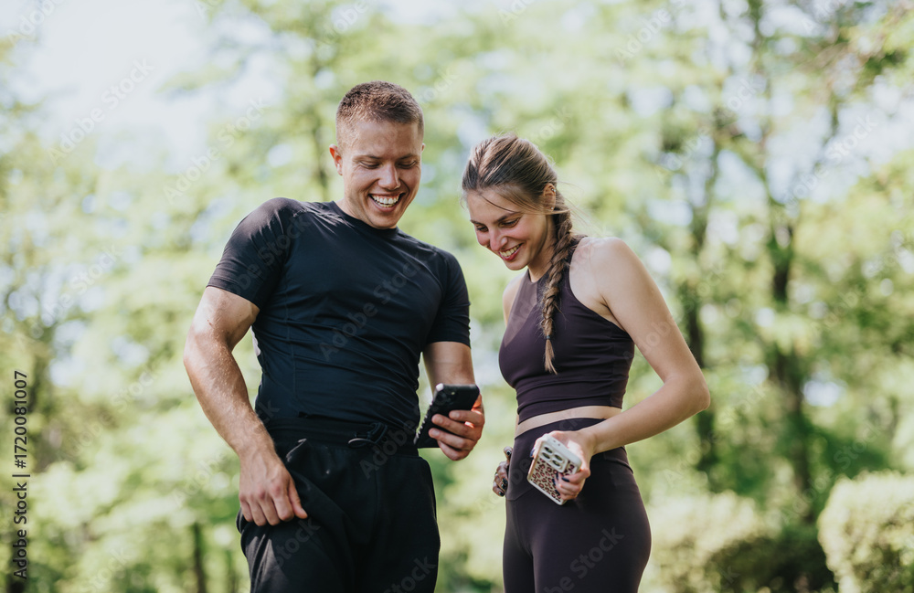 A smiling young couple in a park, dressed in fitness attire, engaging in a friendly conversation while taking a short break from their workout routine amidst lush greenery.