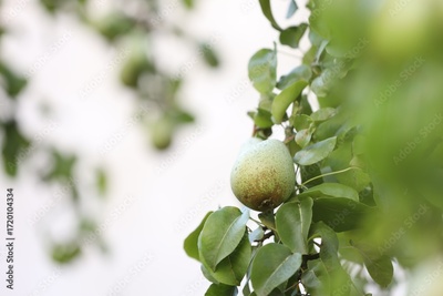 Fresh pear growing on tree outdoors, space for text
