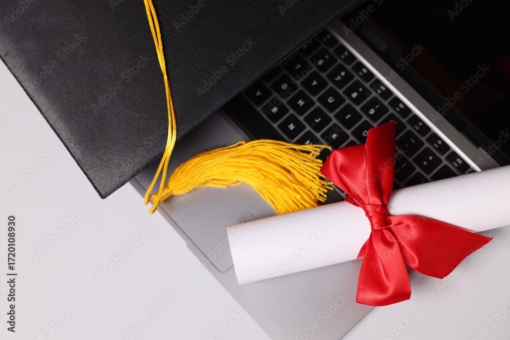 Graduation cap, diploma and laptop on light table, flat lay