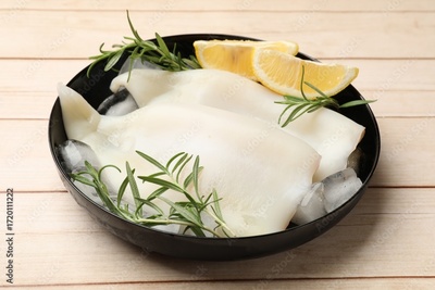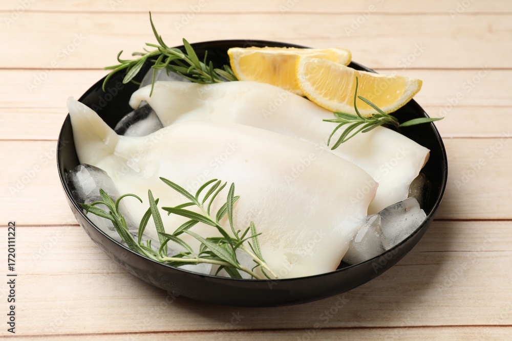 Pieces of raw squids with ice cubes, lemon and rosemary on light wooden table, closeup