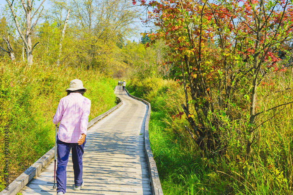 Senior enjoying a healthy stroll on the boardwalk at Deer Lake Park, Burnaby, BC, Canada on a sunny late summer day.