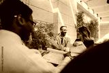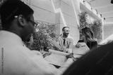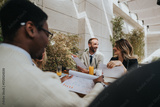 Business people discussing plans and ideas outdoors, enjoying a relaxed atmosphere. Engaged in reviewing documents, sharing ideas, and fostering collaboration in a casual yet productive environment.