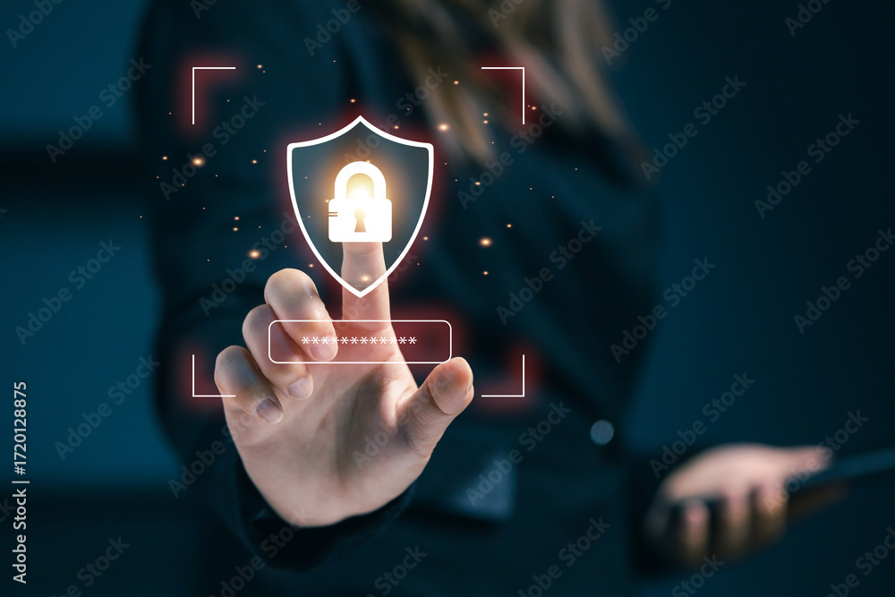 A businesswoman touches a digital shield with lock icon, representing cybersecurity, data protection, password security, and safe online access in modern technology systems.
