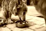 Animal volunteer. Cute dogs eating pet food outdoors, closeup
