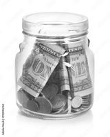 Glass jar with money isolated on white