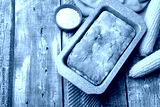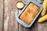 Freshly baked cornbread in baking dish, cobs and flour on color wooden table, flat lay. Space for text