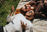 A cheerful couple laying together on a blanket outdoors, enjoying sunny weather.