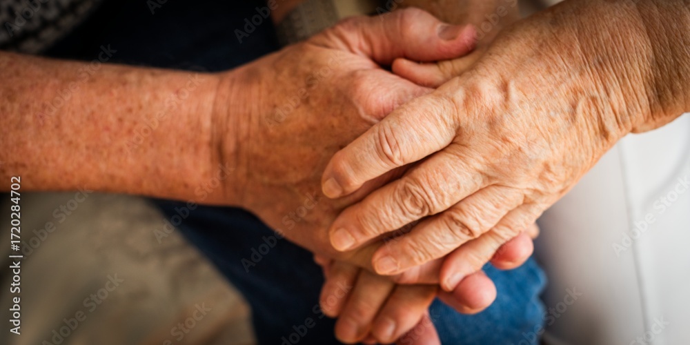 Close-up of elderly hands clasped together, symbolizing support and care. The image highlights aged hands, emphasizing connection and compassion. Elderly couple at care home.