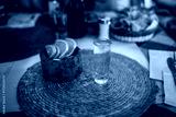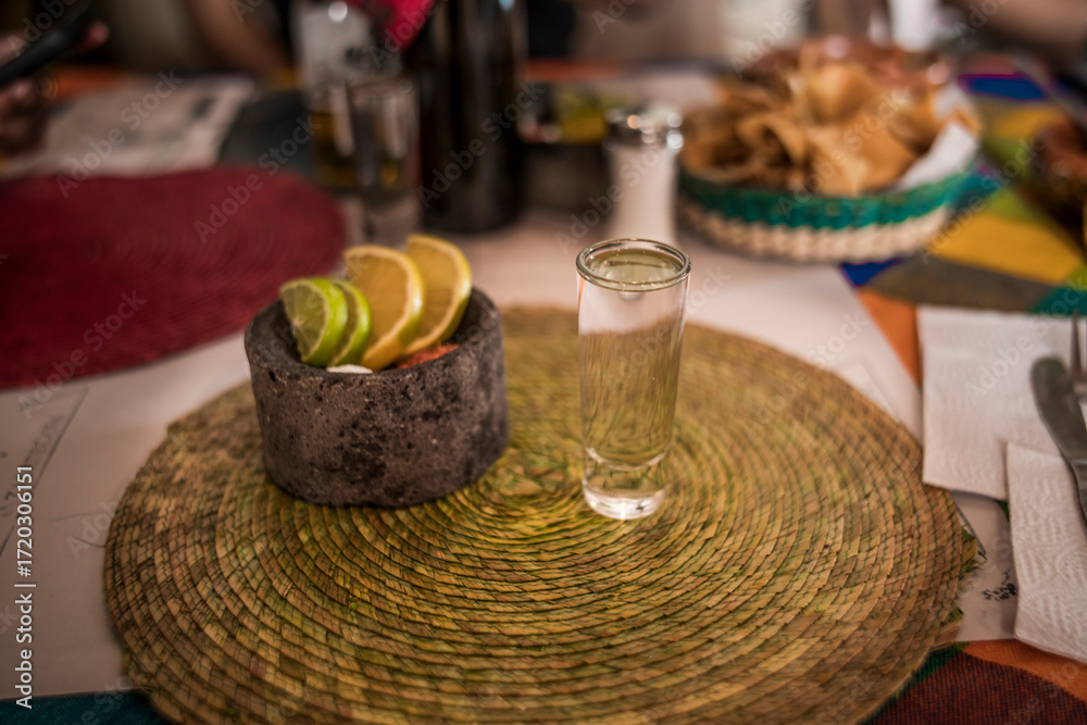 Frontal photo of a delicious crystalline mezcal in its glass caliber, accompanied by worm salt, oranges, and lemon served in a small molcajete.