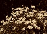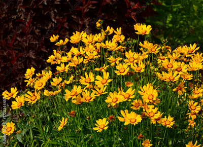 Nachyłek wielkokwiatowy w letnim ogrodzie, Coreopsis grandiflora, żółte kwiaty nachyłka z czerwonym oczkiem, large flowered tickseed in summer garden