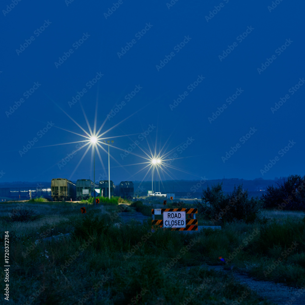 Distant illuminated potash facilities in rural Saskatchewan at night with farmland and dirt road in the foreground.