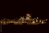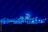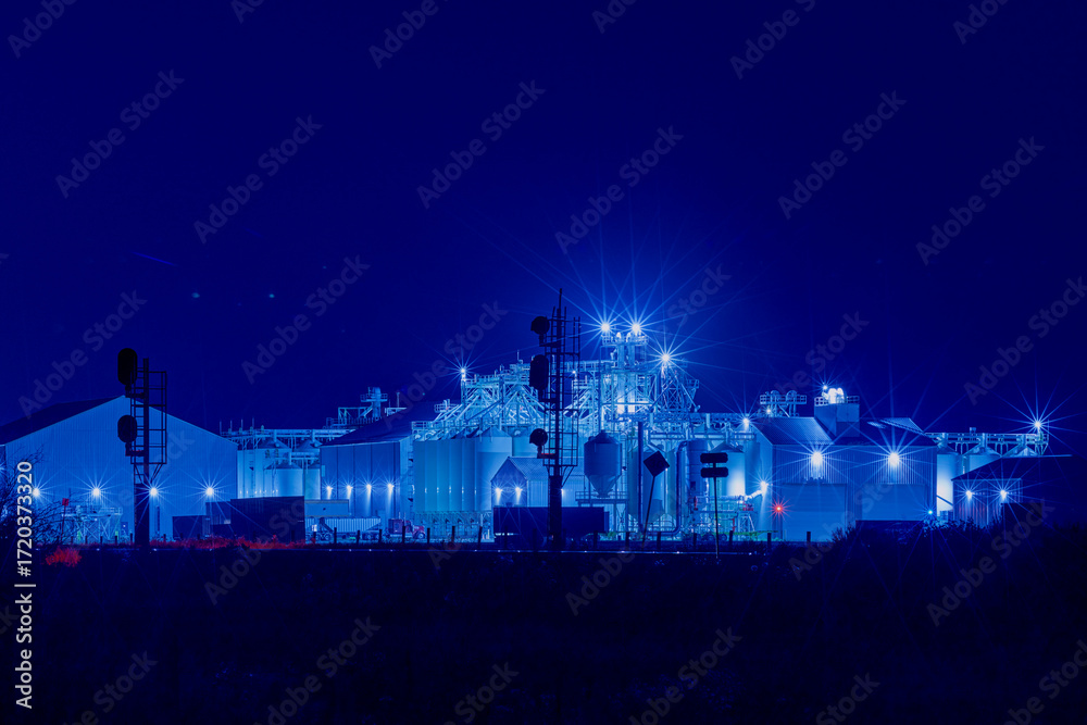 Illuminated grain silo and processing facility in Saskatchewan at night with industrial equipment and twilight sky.