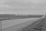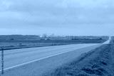 A potash plant with mineral piles seen across autumn farmland from a highway under cloudy skies in Saskatchewan, Canada.