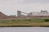 Potash factory with covered mineral piles and rail cars near a water body under cloudy skies in Saskatchewan, Canada.