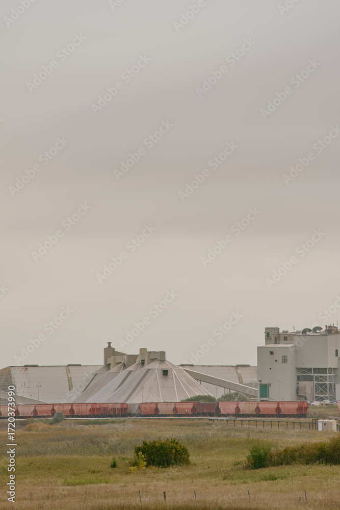 A vertical view of a potash plant with covered mineral piles, conveyor system, and rail cars under cloudy skies in Saskatchewan, Canada.