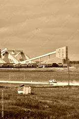 A potash plant with dome storage buildings, conveyor system, and trains across farmland with a dusty road under cloudy skies in Saskatchewan, Canada.