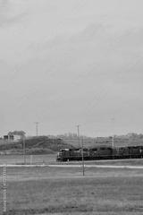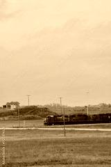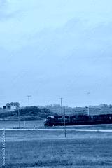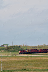 A red Canadian Pacific locomotive travels along a rural railway with grassy fields and cloudy skies in Saskatchewan, Canada.