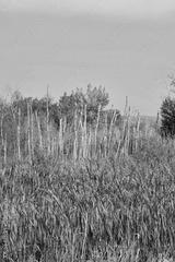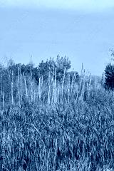 White dead tree trunks stand among green and yellow autumn trees with wetland vegetation in the foreground under a blue sky in Saskatchewan, Canada.
