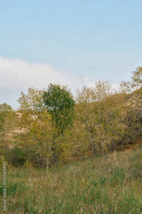A natural landscape of grassy rolling hills with scattered trees under a blue sky and white clouds in Saskatchewan, Canada.