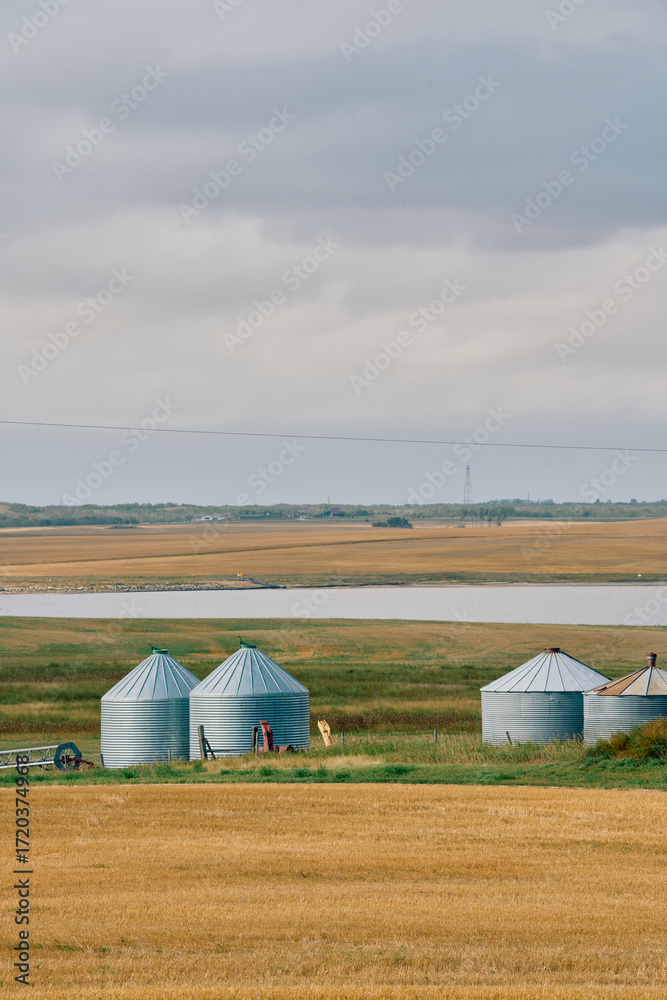 A white farm warehouse and silver grain bins stand beside harvested fields and a water body under cloudy skies in Saskatchewan, Canada.