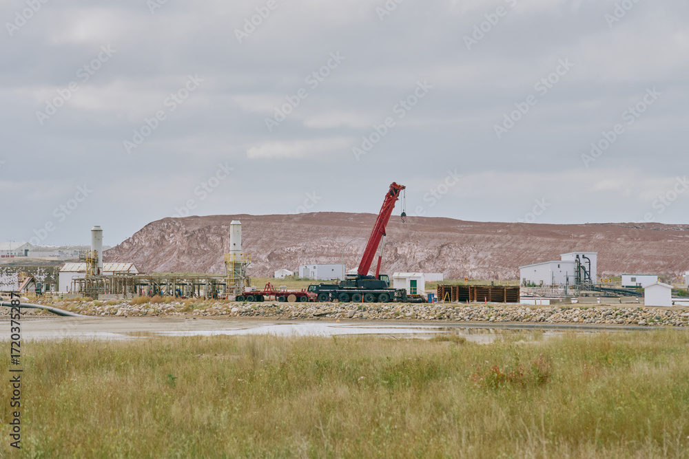 A red crane operates at an industrial facility near a potash mine in Saskatchewan, Canada, with pipelines, storage buildings, tailings pile, and a rocky embankment by the water.