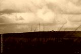 Large red potash tailings pile in Saskatchewan, Canada, with visible erosion line and a vehicle on top, symbolizing mining waste and environmental impact under cloudy sky.