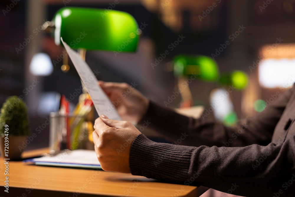 Studious elderly woman prepares research documents in a study room at college, highlighting the intellectual passion of adult learners and her journey through academic life. Close up.