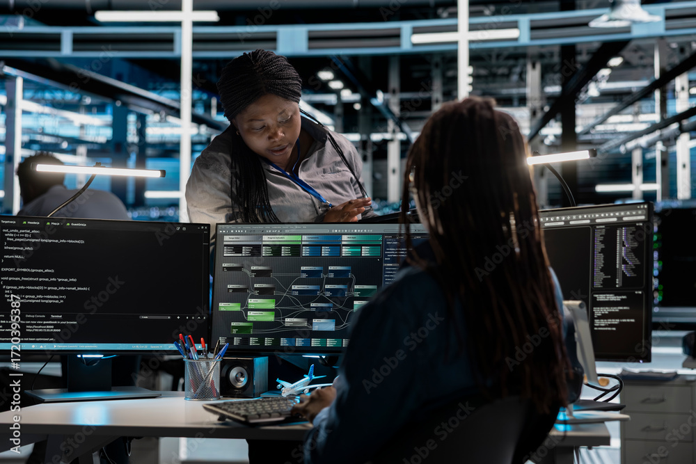 Data center manager supervising engineer setting up machine learning systems handling information. Supervisor oversees worker training node trees neural networks to improve server hub operations