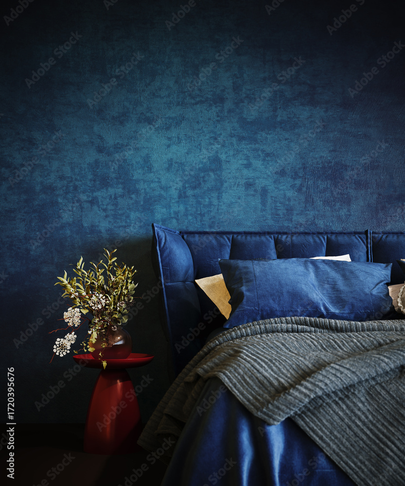 Blue bedroom. Modern interior design of bedroom. 3D Rendering, 3D Illustration