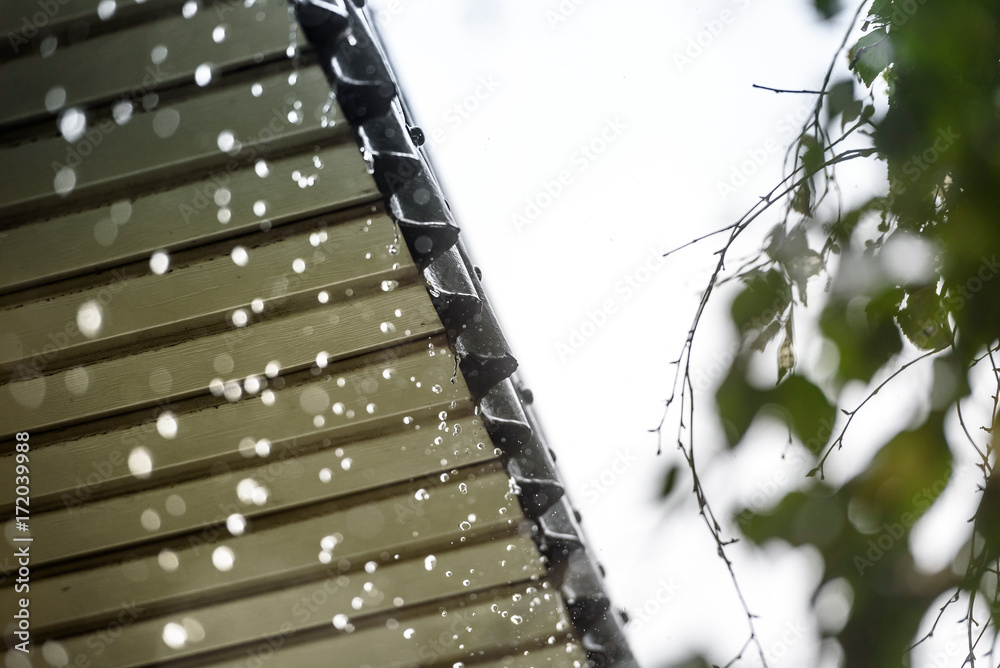 rain flows down from the roof. Close-up. The rainy season