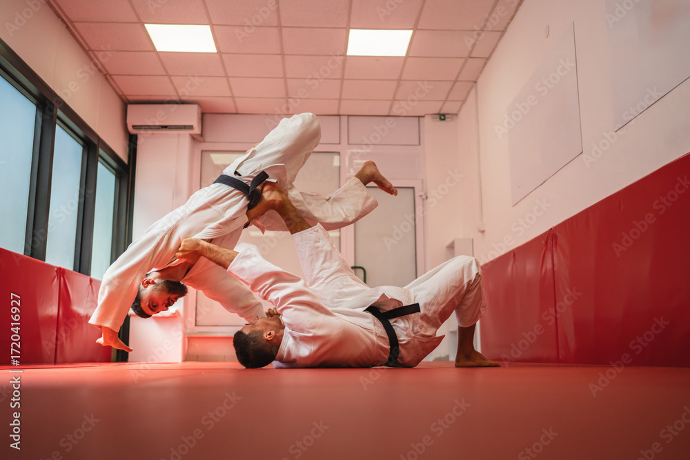 Male judoka practicing judo throw during training session