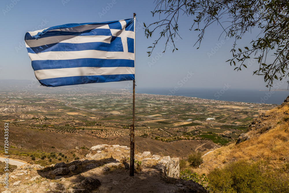 Greek flag at the ruins of Acrocorinth (acropolis of ancient Corinth), Greece