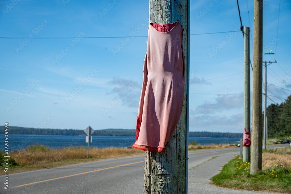 One of many red dresses on Raven Ave, in Old Massett, B.C., Canada. The dresses are used as symbols of missing and murdered indigenous women.