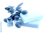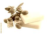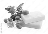 Handmade soap bars, olives, essential oil and green leaves isolated on white