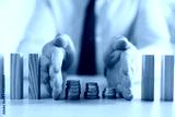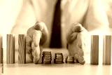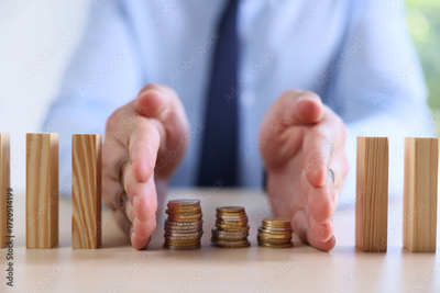 Risk. Man stopping domino effect to protect coins at table, closeup