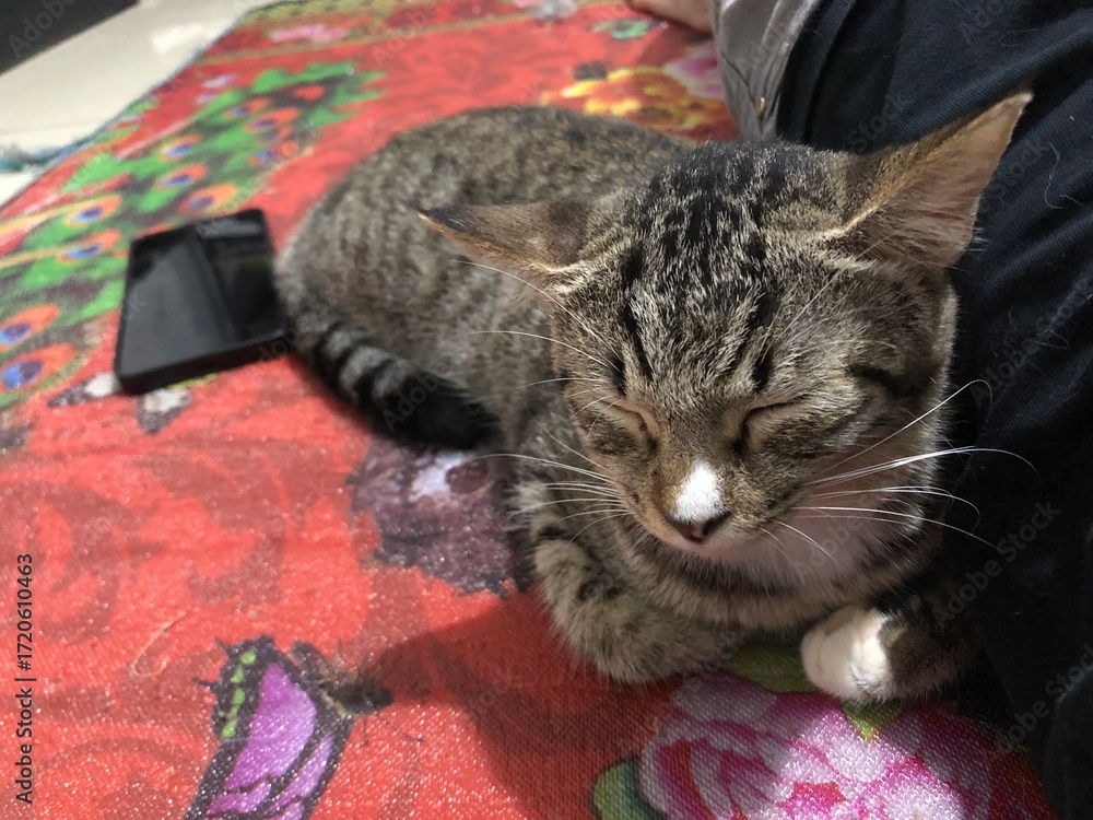 Sleeping tabby cat resting on a colorful blanket with a phone nearby