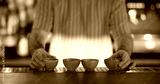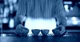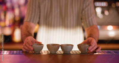 Barman work. Pub process. Bartender preparing row of little clay bowls for traditional oriental beverage. Ceramic dishes for sake.