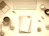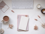 Pink and beige feminine workspace, pastel toned computer desk flat lay top view