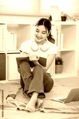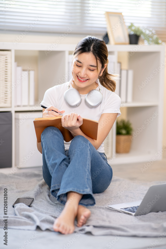 Smiling woman with headphone holding pen writing in book aside laptop and sits on living room floor.