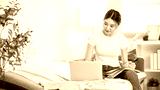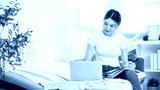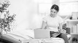 Asian woman holding pen and notebook on lap looking at laptop and sitting on sofa bed in living room