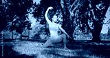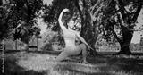 young beautiful white girl doing yoga in park among trees in clearing on summer day