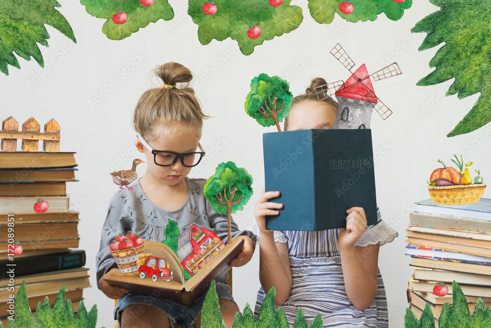 Children read fairy tales in the children's room. The concept of children's imagination and fantasy. Collage of photos and illustrations
