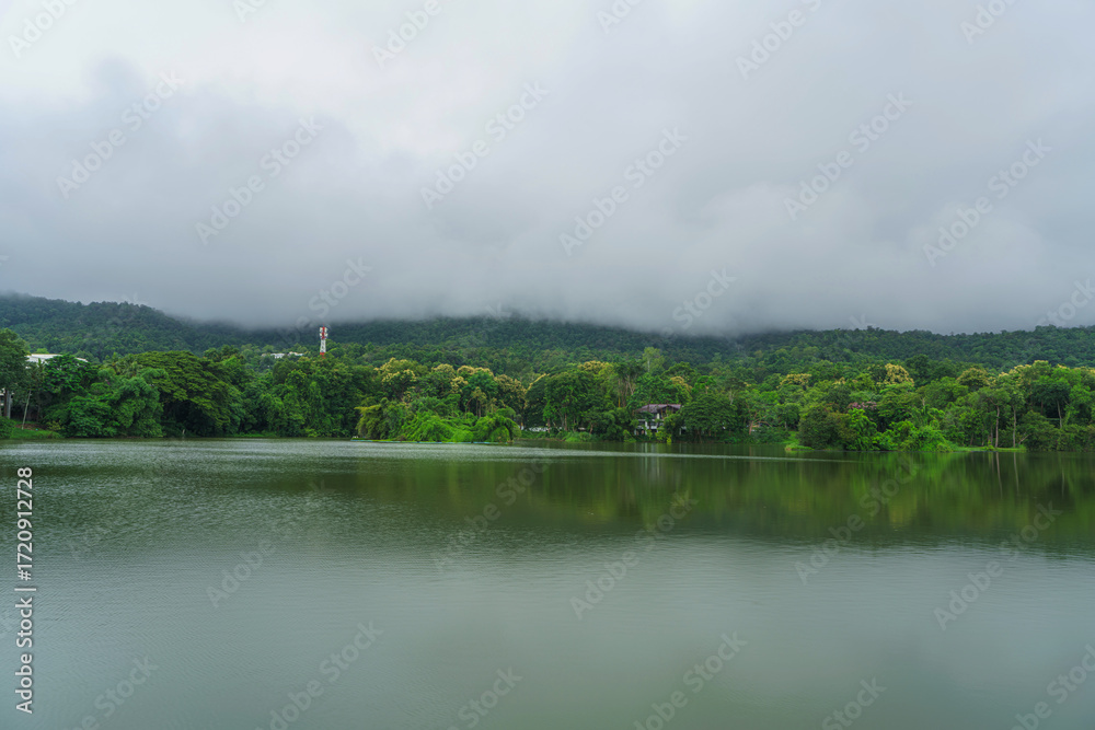 landscape lake views at Ang Kaew Chiang Mai University in nature forest Mountain atmosphere rain fog sky abstract with white clouds. cloudy sky background