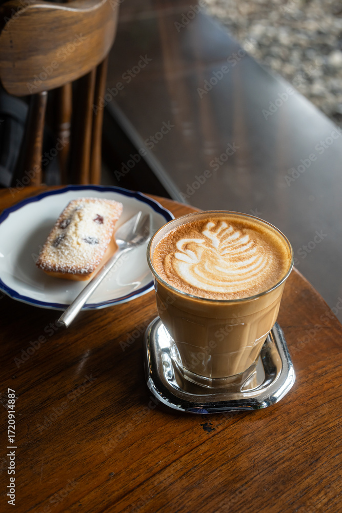 Hot coffee latte with latte art milk foam in cup mug and Homemade Currant financier cake on top view. As breakfast In a coffee shop at the cafe,during business work concept,vintage style