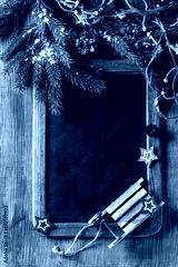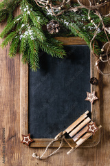 Vintage empty chalkboard with fir Christmas tree and wood modern decor over wooden background. Top view with space for text