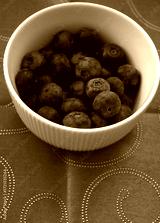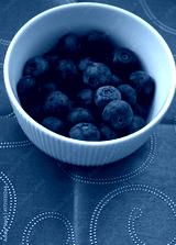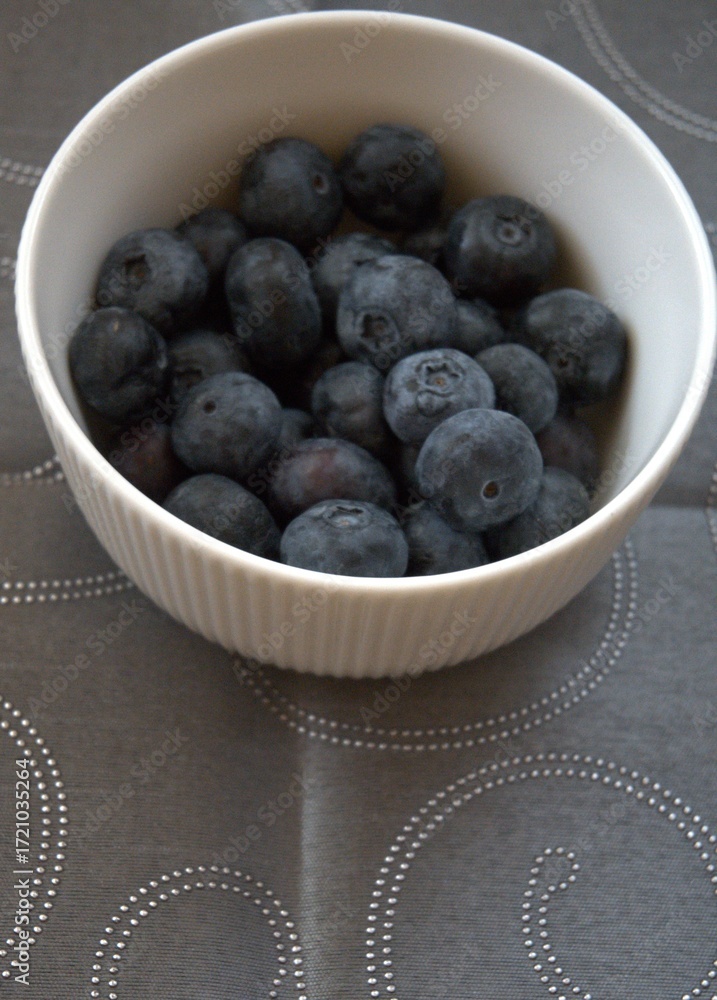 A close-up of ripe blueberries in a white bowl placed on a fabric tablecloth. Minimal composition with copy space for text.