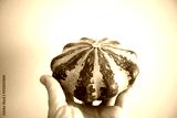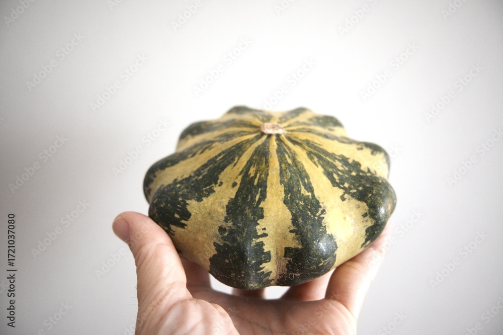 A hand holding a green-yellow ornamental squash against a white background. Minimal close-up composition.