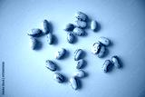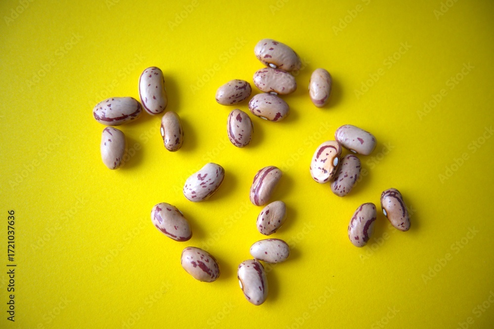 Dry beans scattered across a yellow surface. Minimal close-up with copy space for text.
